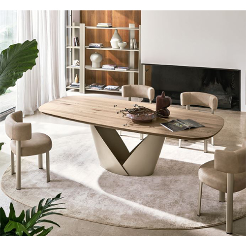 Стол Call a с характерным металлическим основанием, напоминающим чашечку цветка , название которого он носит, также доступен со столешницей из цельного дерева.