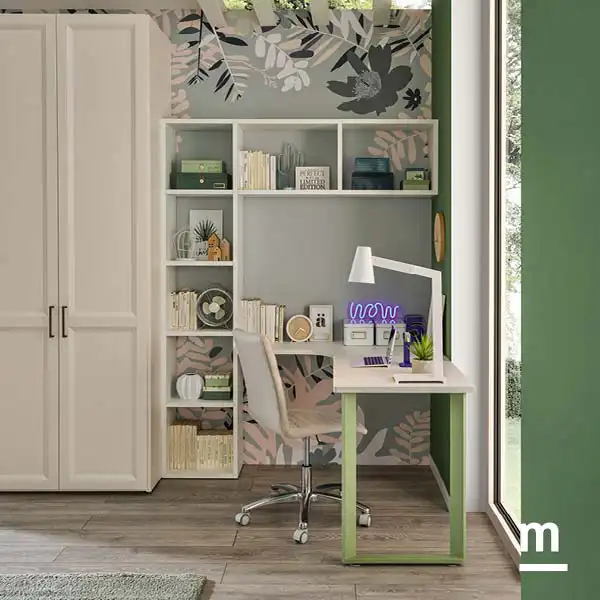 Чтобы сконцентрироваться во время учебы, вам понадобится хорошо оборудованный рабочий уголок. Примером может служить этот угловой письменный стол, поддерживаемый с одной стороны стороной Form из лакированного металла и упирающийся в настенный книжную полку с другой стороны. Столешница выполнена в светло-белом цвете и благодаря большой поверхности обеспечивает максимальный комфорт для тех, кто учится, оставляя под рукой место для всего необходимого.